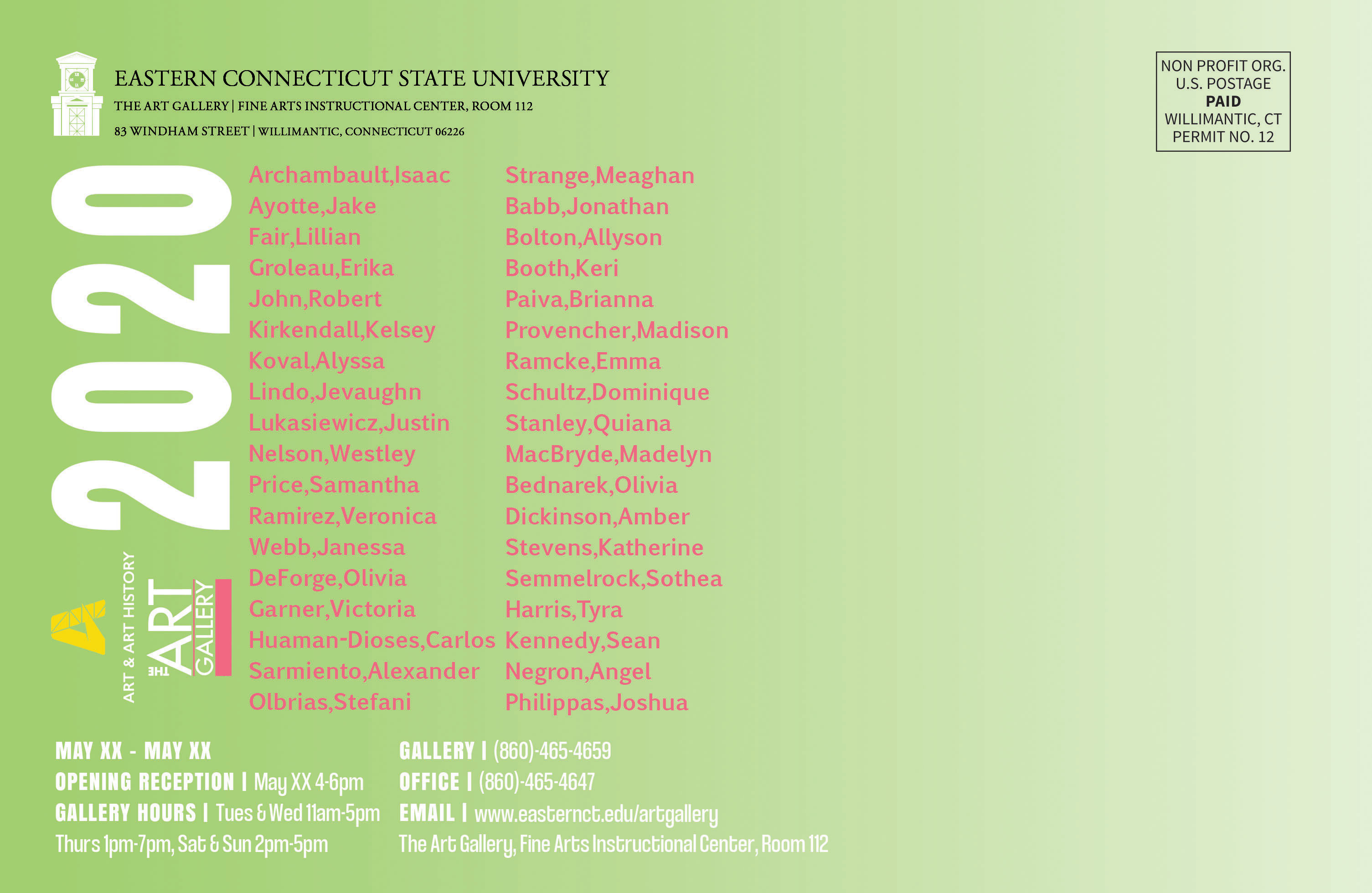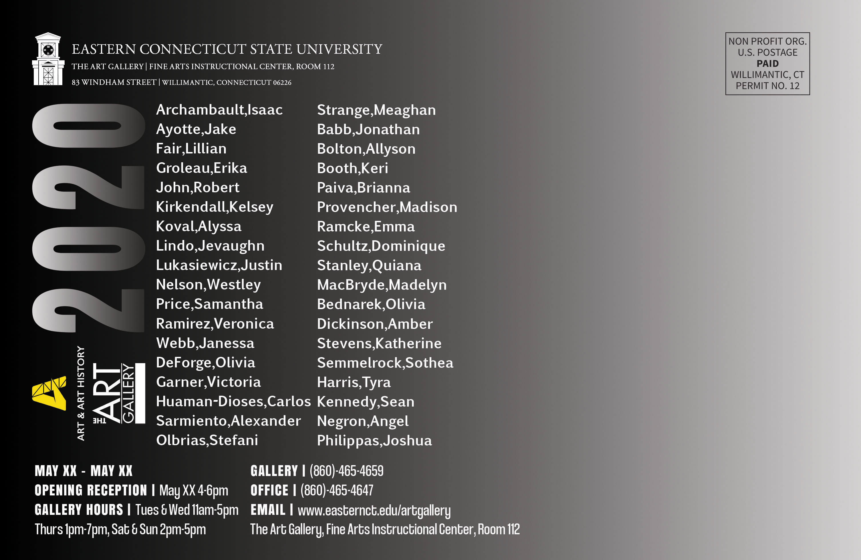 For Graphic Design III, all students must create postcards, posters, and monitor ads for the annual Senior Art Exhibition. My Professor loved my design so much that she had me create it in two different color schemes.