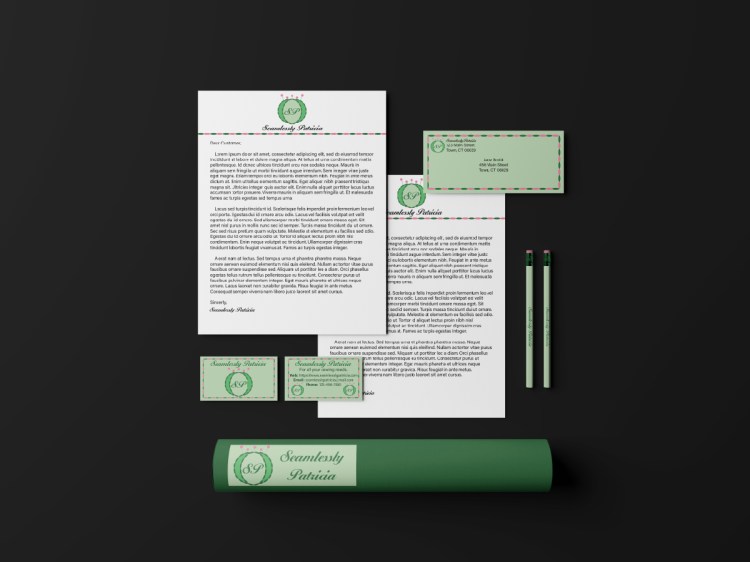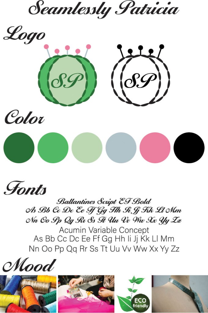 In Graphic Design II, students were to create a logo, concept board, and mockups for a made-up company. My mother is a seamstress and was the inspiration for my assignment.